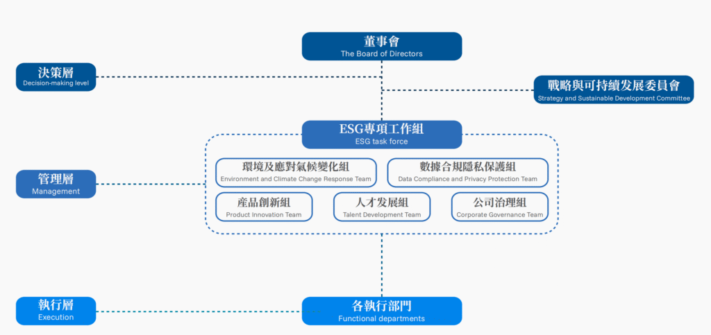 We have established a comprehensive and efficient three-tier ESG governance framework with clear responsibilities at all levels. Under this framework, we systematically promote ESG governance through three levels: oversight and planning by the Board of Directors and its Strategy and Sustainable Development Committee, management driven, and operational implementation, to ensure that the Group can fully consider the potential impacts, risks and opportunities of the environmental, social, and governance factors in our business decision-making and daily operations. In 2024, we further strengthened our management responsibilities in response to climate change by integrating a low-carbon transition into the core agenda of our business development.