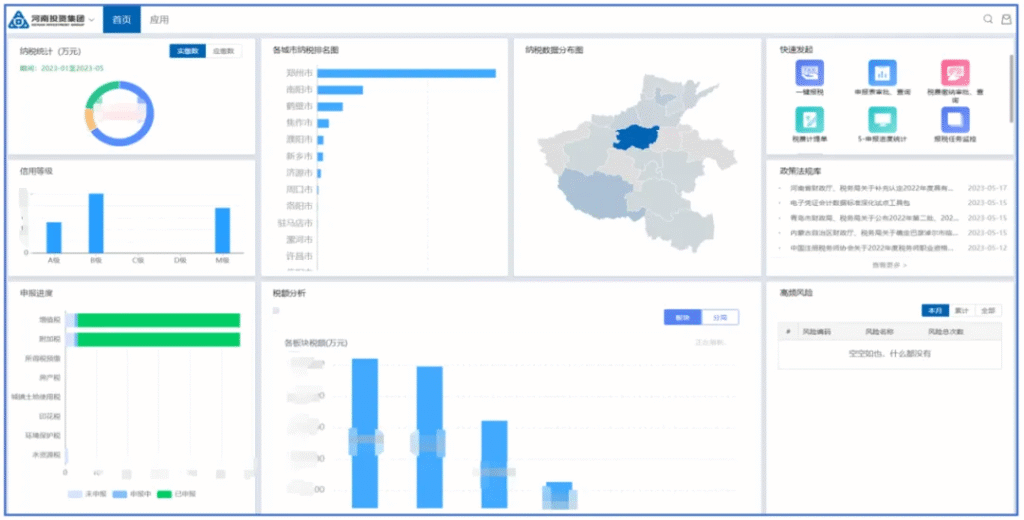 10.稅務全景化統計分析。通過智慧稅務平臺的稅務統計分析功能,實現集團稅務資料即時全景化統計分析。比如,通過納稅統計及穿透查詢,可實現集團層面按稅種、稅期、板塊、分局等多維度進行稅務資料統計,其中納稅統計功能可直觀展示各稅期的納稅總額,同時支持稅額穿透,查看各公司各月份納稅具體情況;申報進度監控功能可實現集團對各企業申報完成進度的即時監控,並支援穿透查看各公司的報稅情況;另外,每月稅期前系統會自動向各公司辦稅人推送待報稅資訊,降低漏報風險;還可通過河南省納稅地圖、各城市納稅排名、板塊納稅情況、分局納稅情況直觀展示各地區納稅貢獻情況,並可穿透至各公司申報表介面,查看納稅的具體情況。