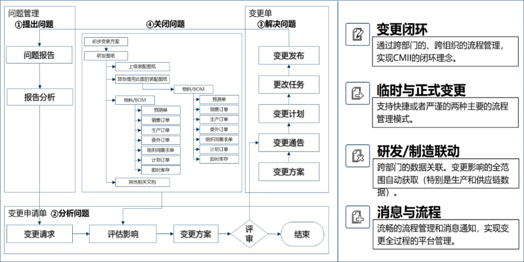 建立規範的設計變更流程,並分不同場景設計不同的流程範本,設計變更一旦發生,首先要分析變更的影響範圍,包括影響到哪些技術檔、涉及哪些關聯產品、物料、BOM,以及涉及物料的庫存、在途在制情況,以便制定合理的變更方案,減少因變更造成的損失。