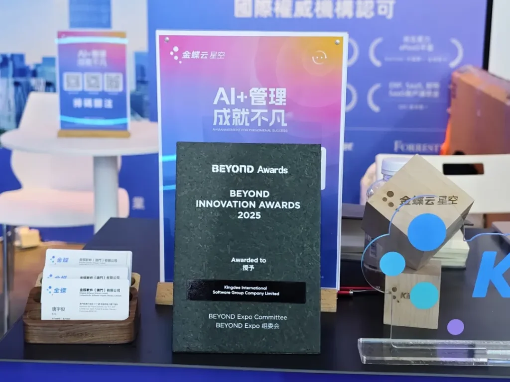 In the BEYOND Global Innovation Selection announced at the same time as the expo, Kingdee Cloud Starry Sky submitted by Kingdee Macau stood out from more than 300 declared technologies and won the [BEYOND INNOVATION AWARDS 2025] with its dual breakthroughs in “Assembleable Enterprise PaaS Platform” and “AI Application in Manufacturing Scenarios“. As a core component of the expo, the BEYOND Awards have long been regarded by the industry as an important honor indicator in the field of technology. This award is a full affirmation of Kingdee’s “technology-enabled enterprise” and a high recognition of Kingdee’s AI innovation achievements in the field of enterprise management.