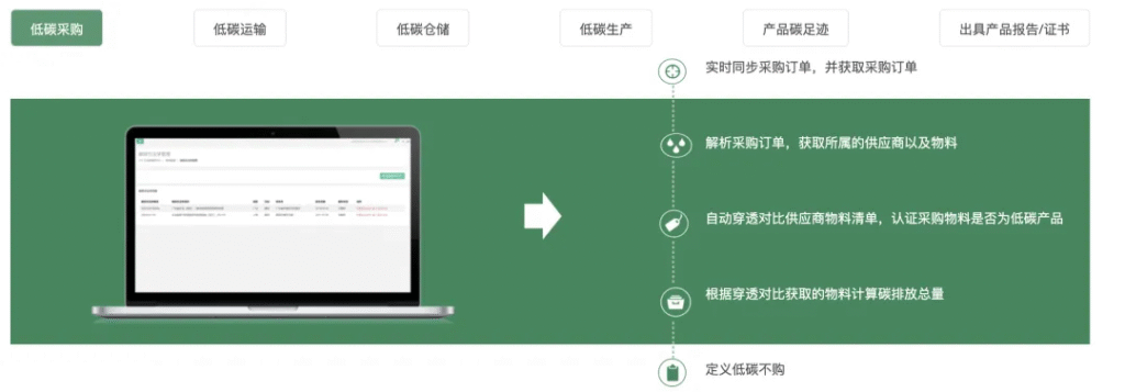 3.Low Carbon Purchase Order: Synchronize third-party system orders or create new ones, retrieve based on the purchased materials of the order and the corresponding suppliers, match the carbon footprint, to determine whether this procurement is low-carbon green procurement.