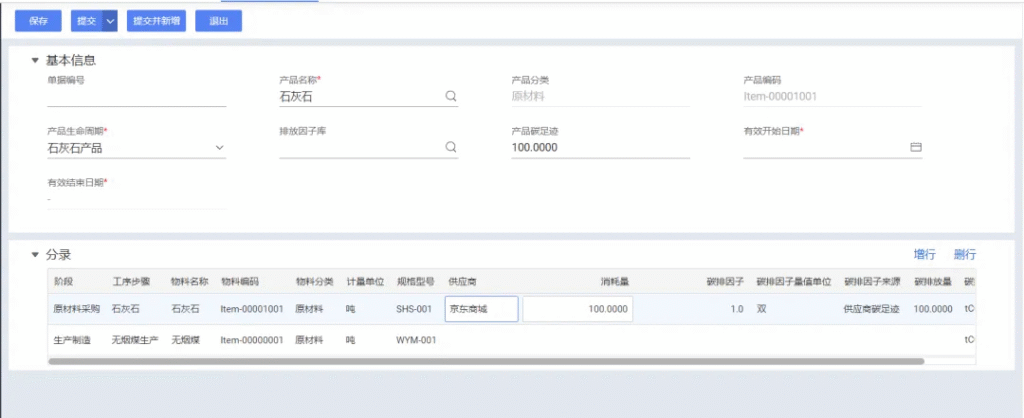 5.Carbon emission statistics for production: Synchronize with third-party systems, or create new entries for the consumption of raw material inputs, fossil fuels, and energy sources, both direct and indirect, during each process of product production, as well as the product output, to calculate the carbon emissions in the production stage.