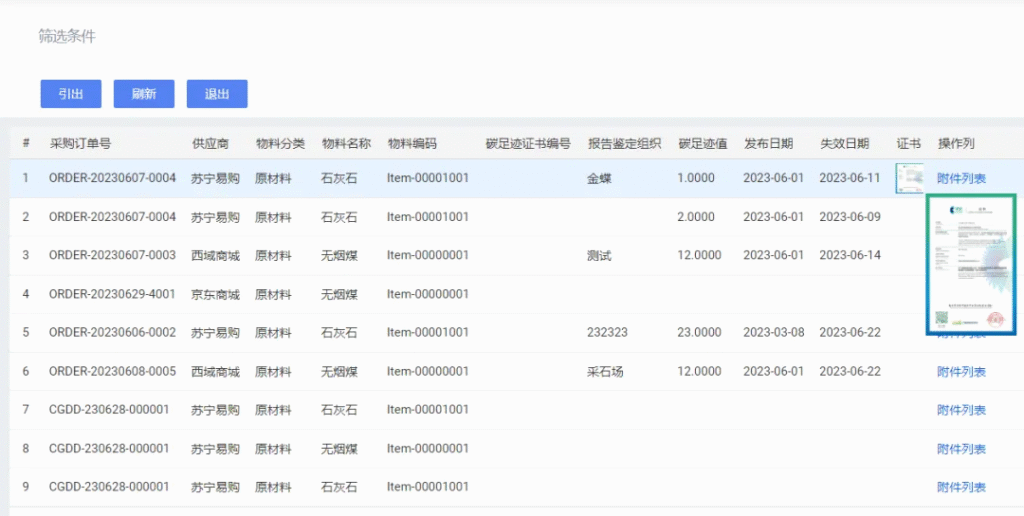 2.Supplier material carbon footprint: Maintain different versions of the carbon footprint report certificates, carbon footprint values, validity periods, and issuing institutions for suppliers’ available materials, providing a basis for identifying whether the materials are low-carbon and green.