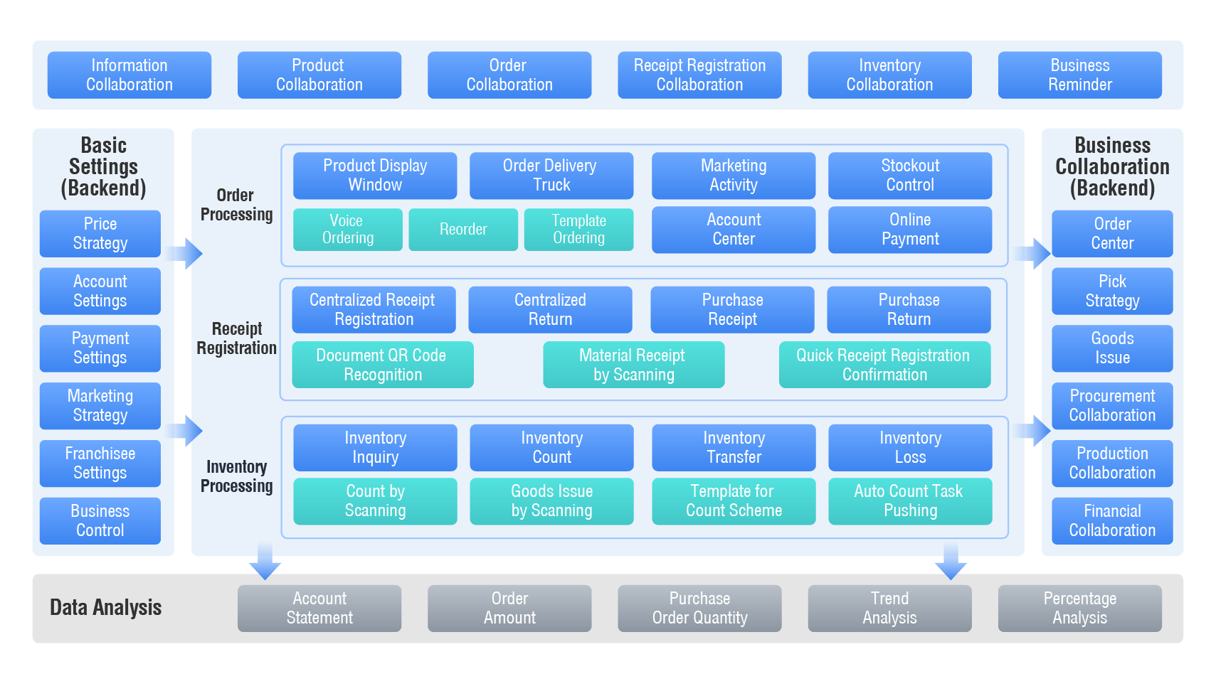 End-to-end applications—including ordering, POS, delivery, membership, e-commerce and store-location analysis. The Order Hub unifies orders from delivery apps, mini-programs, group-buy platforms and more