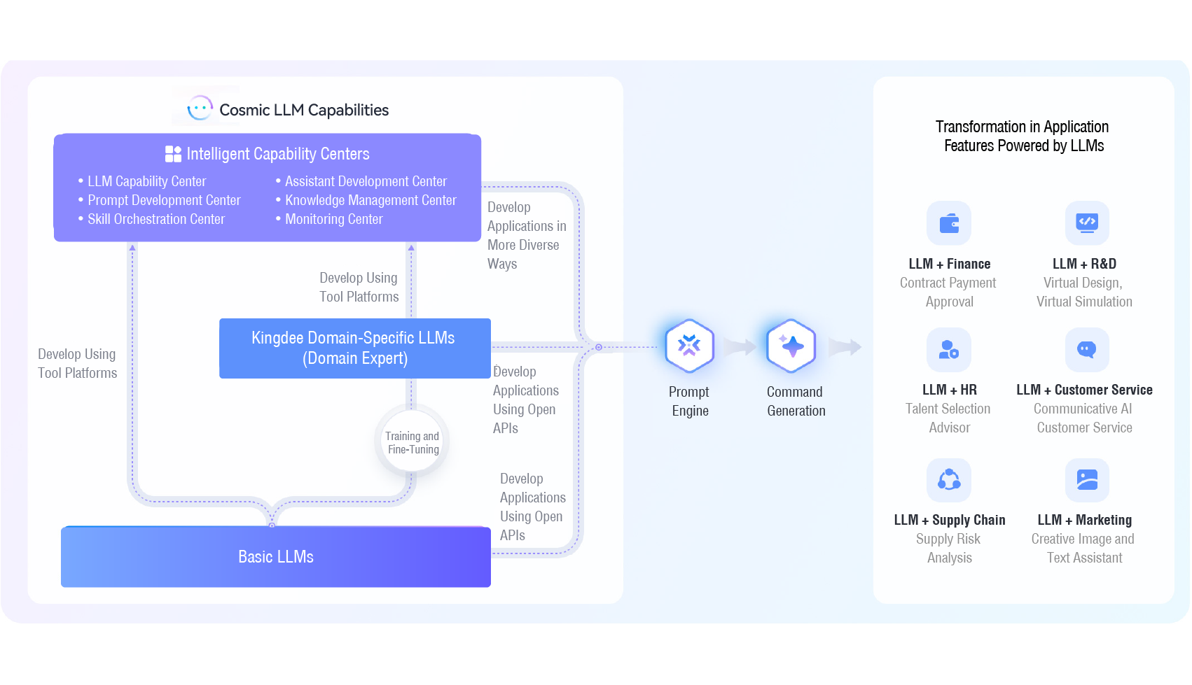 The Kingdee Cloud · Cosmic platform is built on a cloud-native + AI-native technological foundation, adopting a composable approach. It integrates advanced technical capabilities such as dynamic domain models, low-code suites, large models, and AI Agent architecture to form a next-generation enterprise-level AI platform. This enables rapid construction and flexible assembly of intelligent applications.