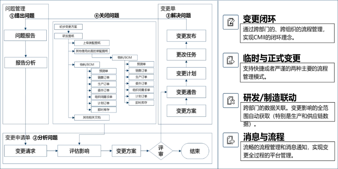 建立规范的设计变更流程,并分不同场景设计不同的流程模板,设计变更一旦发生,首先要分析变更的影响范围,包括影响到哪些技术文件、涉及哪些关联产品、物料、BOM,以及涉及物料的库存、在途在制情况,以便制定合理的变更方案,减少因变更造成的损失。