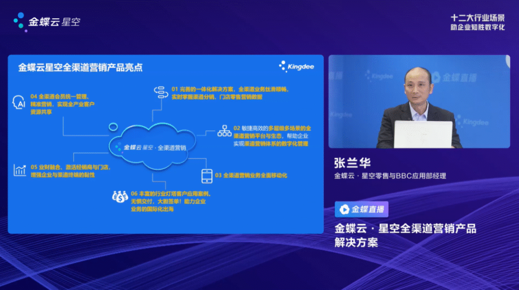 金蝶云·星空零售与BBC应用部经理张兰华介绍到,金蝶云·星空全渠道营销云产品,基于金蝶云星空企业云平台的基础,与财务、供应链、制造、ERP等基础应用一体化的渠道云和零售云的应用结合,为品牌商、渠道商、零售商、消费者提供了丰富的前端应用。